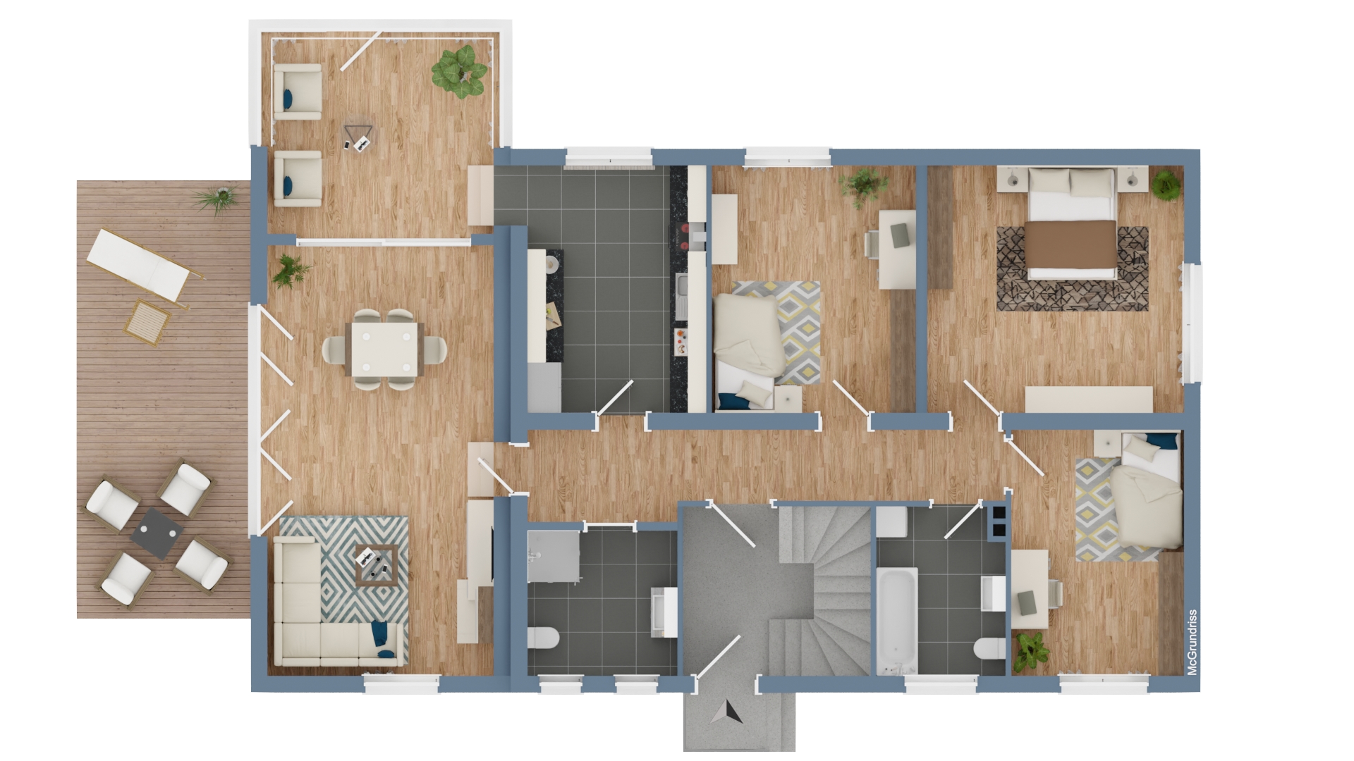 Das Haus verfügt über 2 getrennte Wohnungen, die auch gemeinsam genutzt werden können und teilt sich wie folgt auf: