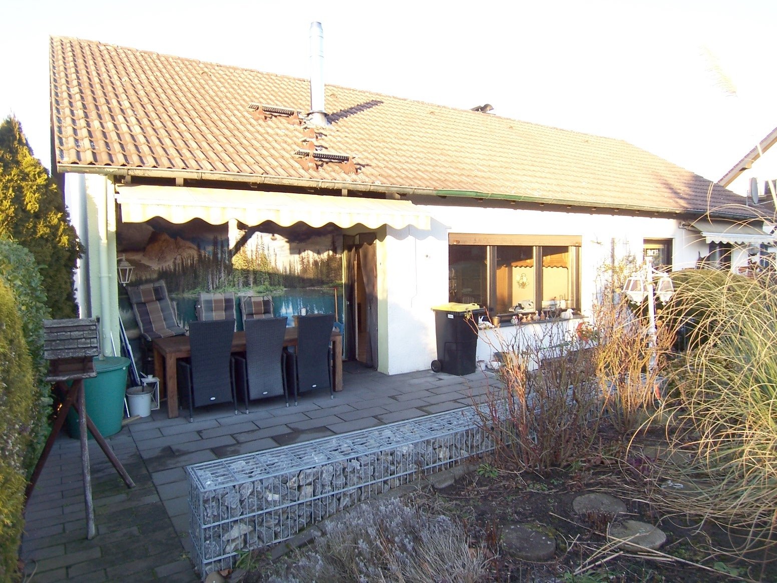 1. Wohnzimmer mit Zugang zur Süd-Terrasse, die über eine Markise verfügt.