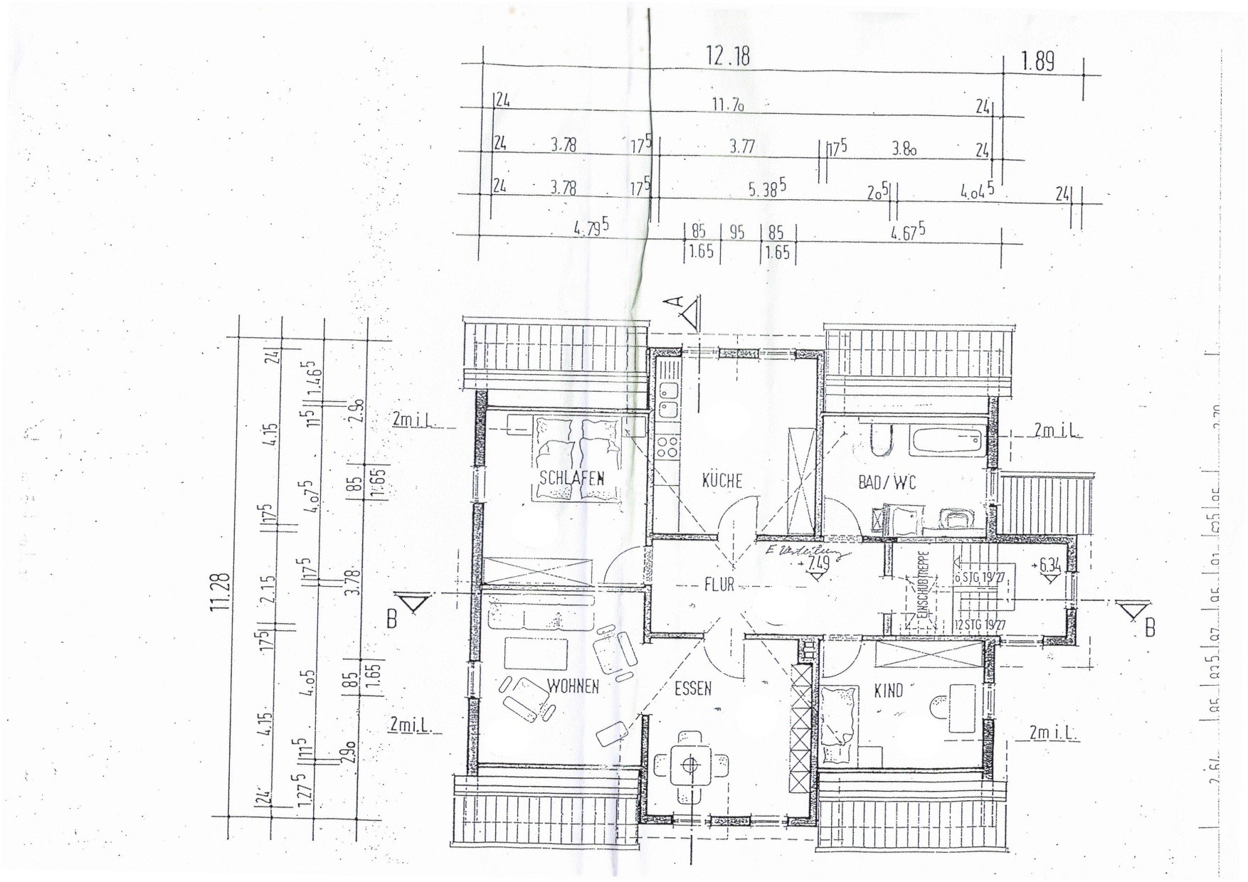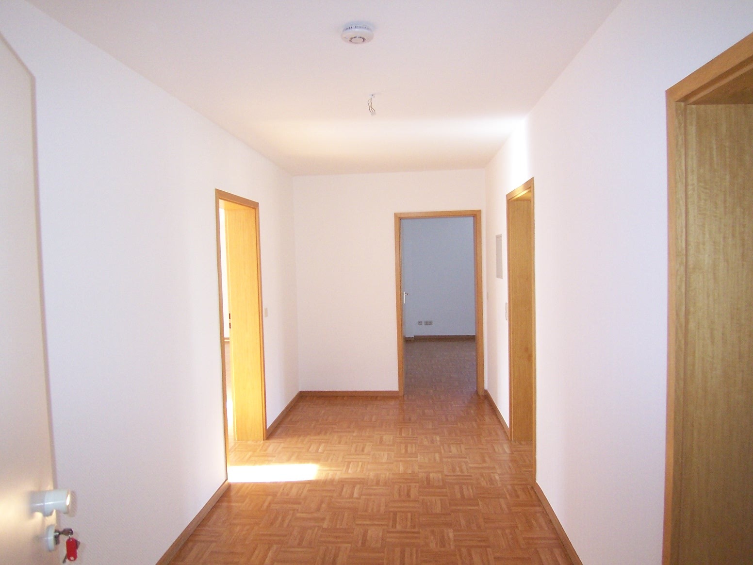 Vom Flur aus haben Sie Zugang zum Esszimmer mit sich anschließendem Wohnzimmer, zum Schlaf- und Kinderzimmer, zur Küche mit Einbauküche sowie zum Bad mit Dusche, Badewanne und Fenster.