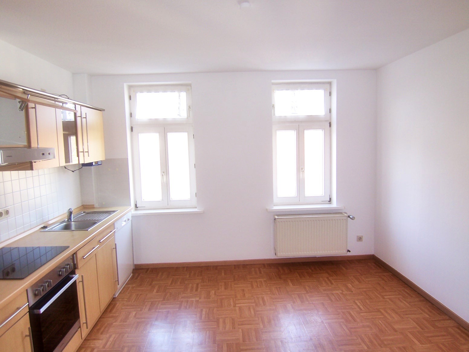 Vom Flur aus haben Sie Zugang zum Esszimmer mit sich anschließendem Wohnzimmer, zum Schlaf- und Kinderzimmer, zur Küche mit Einbauküche sowie zum Bad mit Dusche, Badewanne und Fenster.