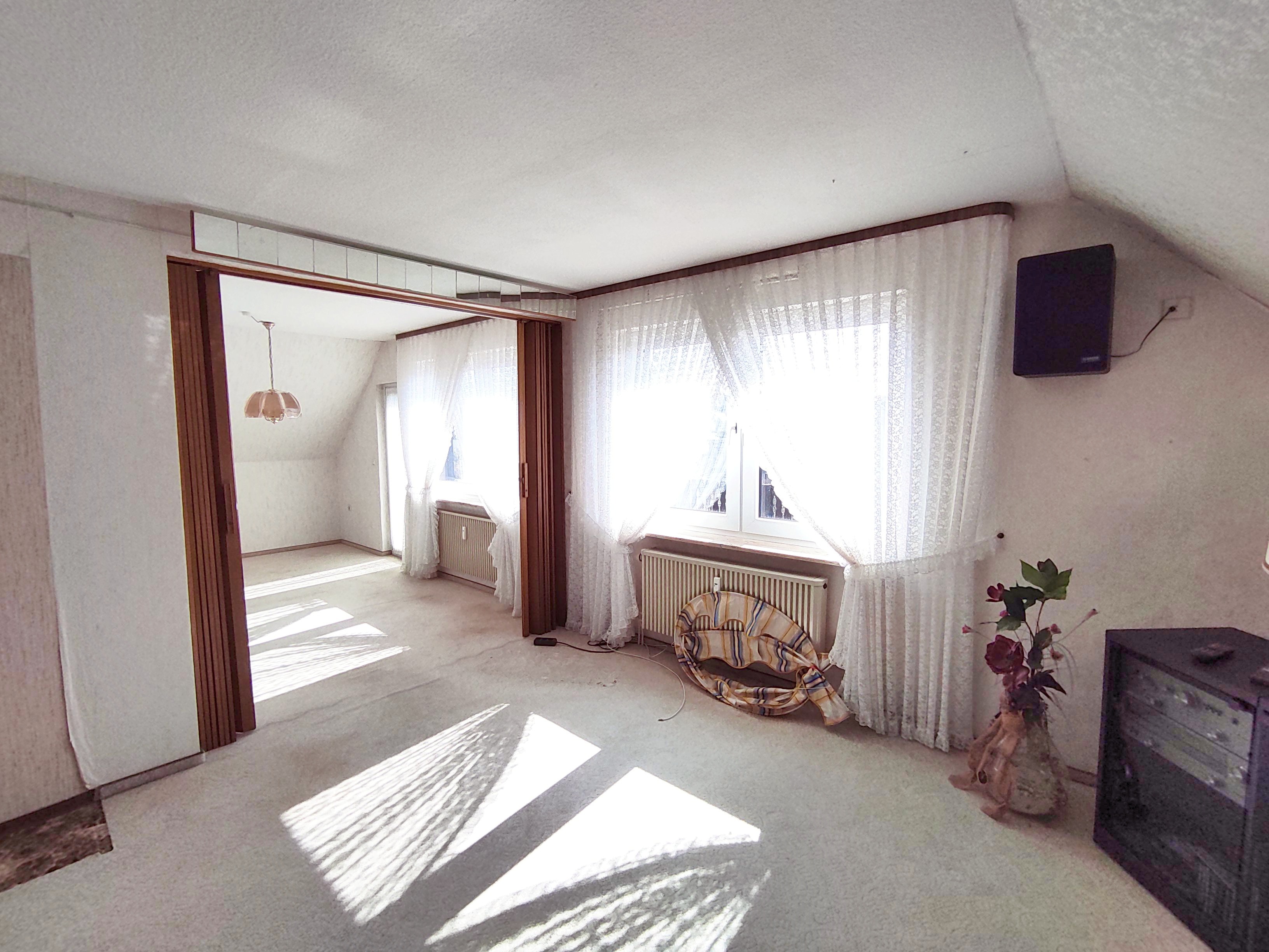 Wohnzimmer mit Arbeits- oder Essbereich und Zugang zum Süd-Balkon (nicht in der Wohnfläche enthalten), der über eine Markise verfügt (Balkonanbau in 1998).