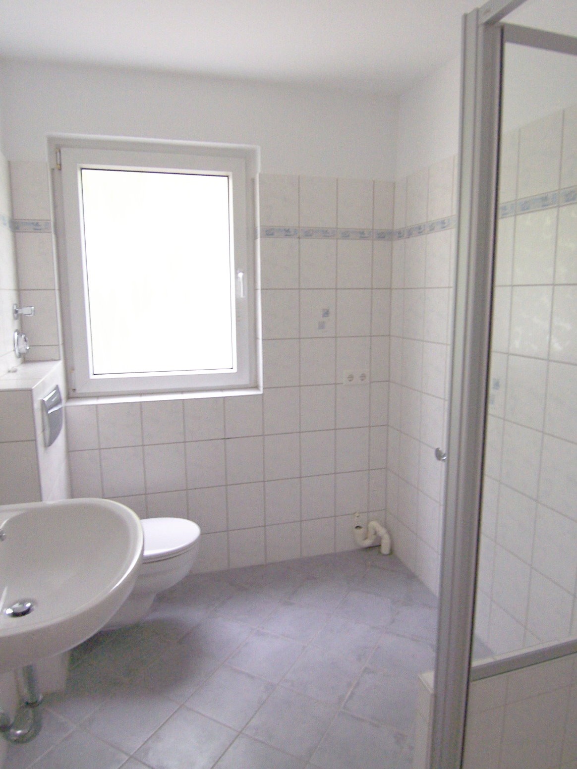 Das Duschbad mit Anschlussmöglichkeit für eine Waschmaschine verfügt über ein Fenster.