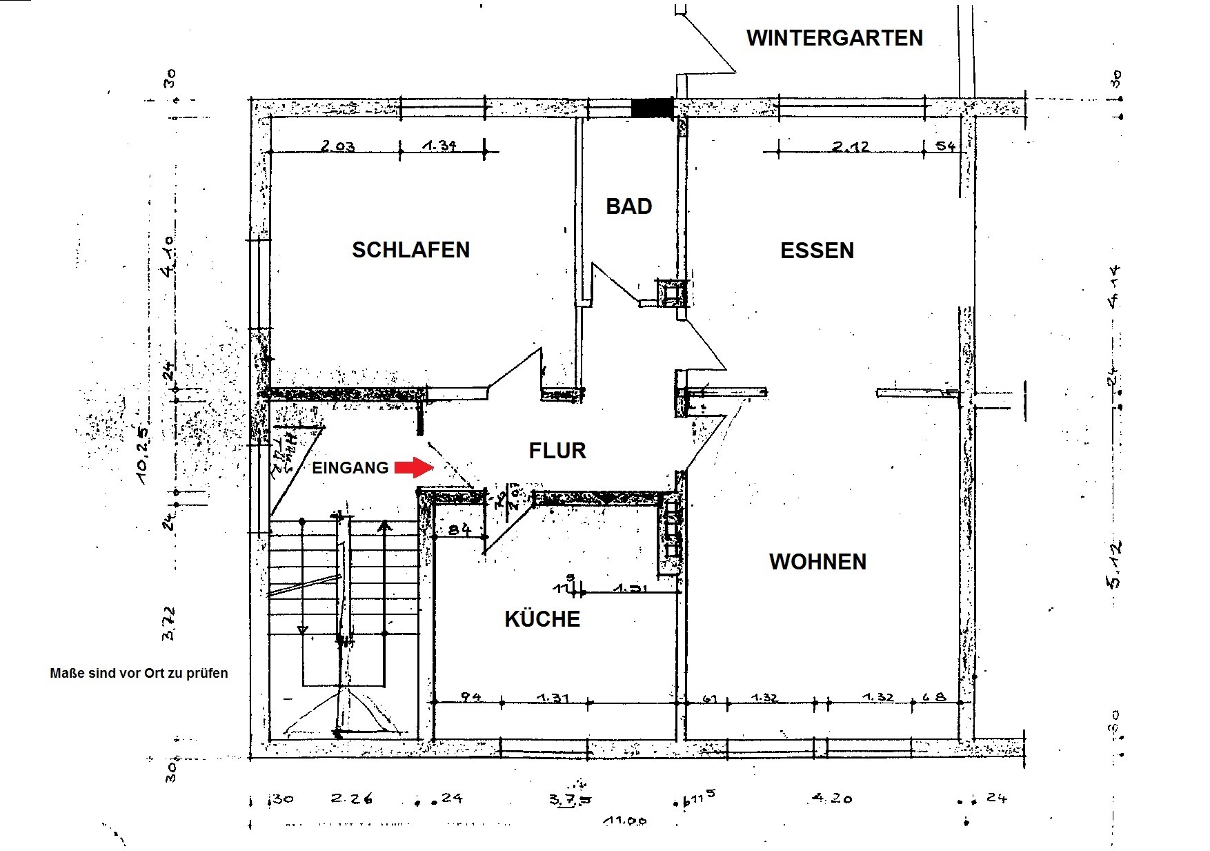 Das wären die Zimmer Wohnen und Essen (mit Zugang zum beheizten Wintergarten), die durch eine Schiebetür verbunden sind, das Schlafzimmer, die Küche und das helle Bad mit Dusche und Fenster.