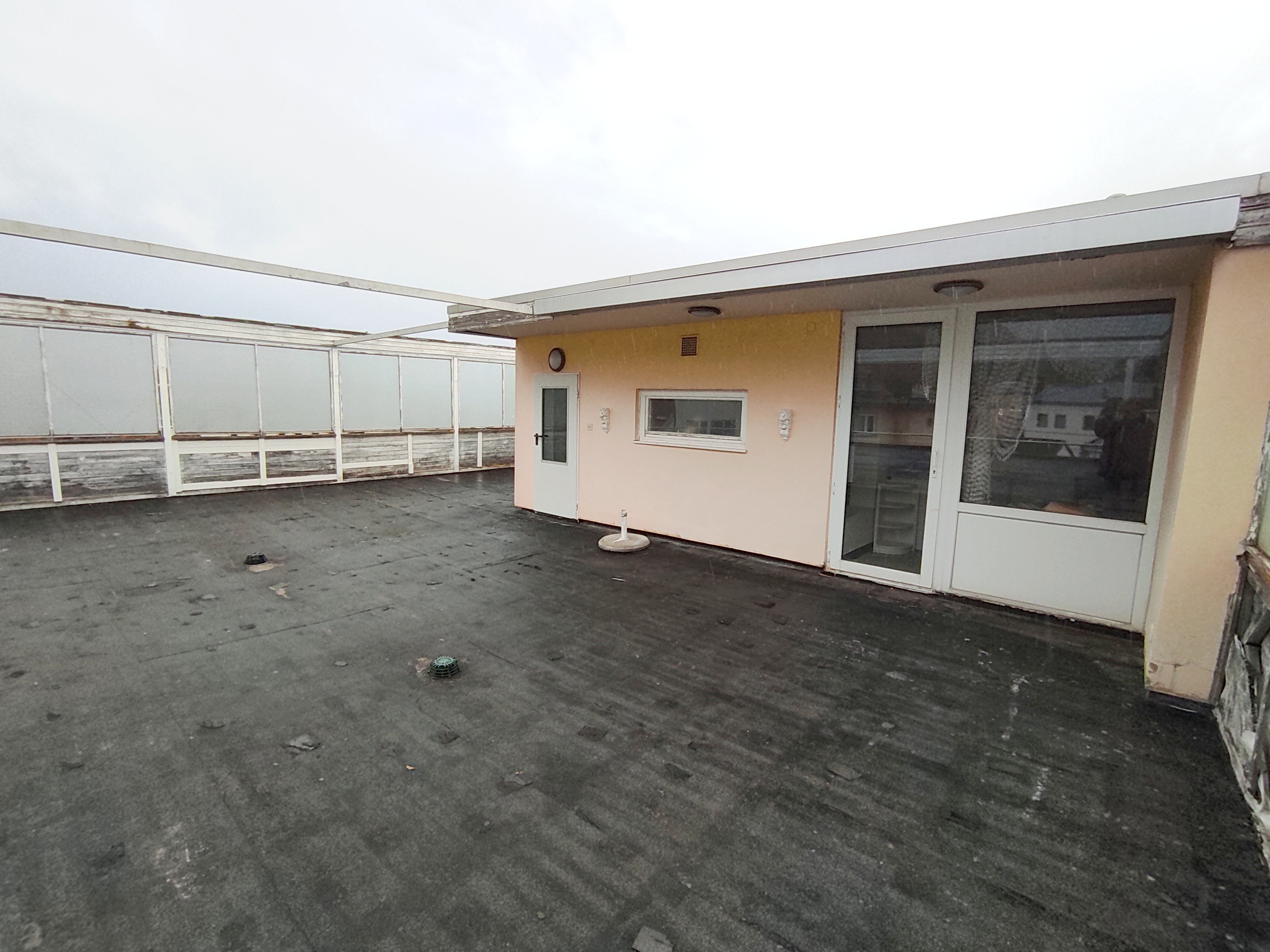 2 Wohnzimmer (über Durchbruch verbunden), Schlafzimmer, Küche (offen zur großen Diele), Bad/WC, Abstellraum, Dachterrasse (ca. 76 m²) mit zusätzlichem Raum mit Singleküche